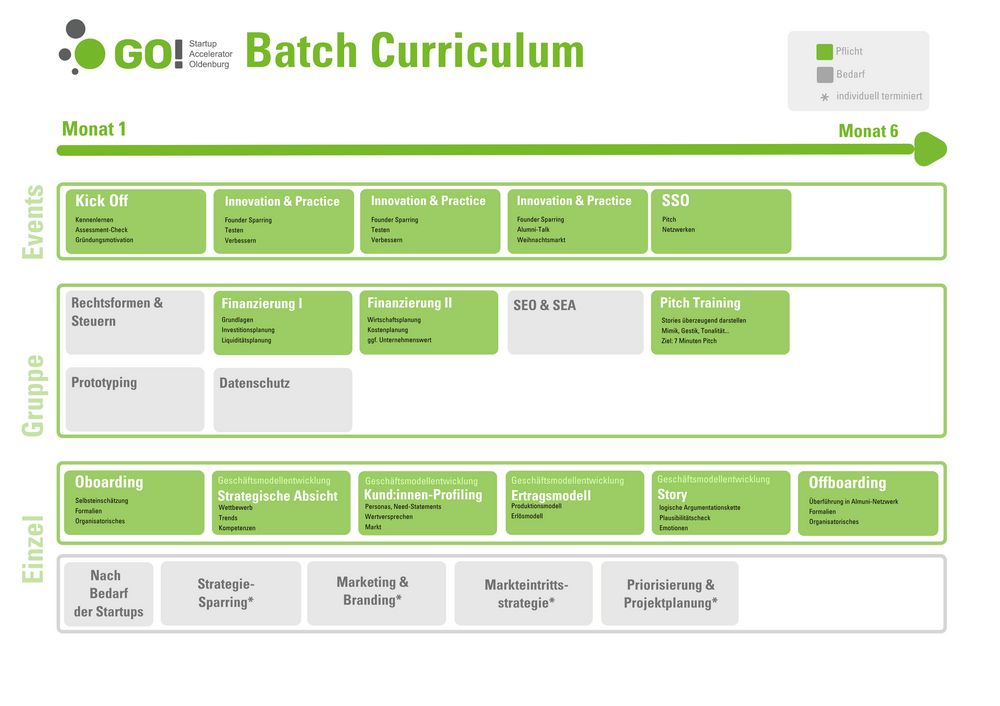 Das GO! Curriculum ist auf Startups in der Ideen- und Konzeptionsphase, als auch in der Prototypenphase konzipiert. Der modulare Aufbau wird individuell auf den jeweiligen Stand und die individuellen Bedürfnisse der Teams angepasst.